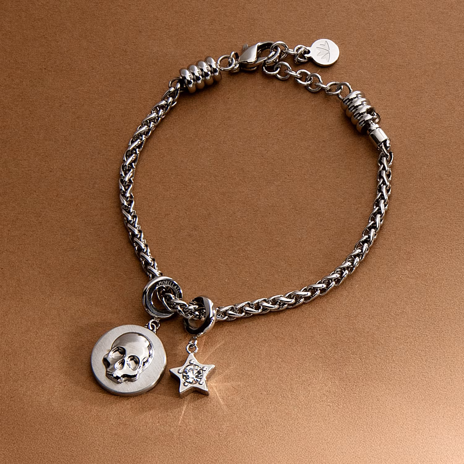 Bracciale Teschio Stella Morellato Drops SCZ1444. Uno bracciale ricco di significato ed emozione! Charm a moneta con teschio in rilievo e stella! Realizzato in acciaio inossidabile antiallergico lucido e satinato, firmato Morellato! Lunghezza regolabile 16-19cm, charm 1.5*1.5cm. Chiusura a moschettone.